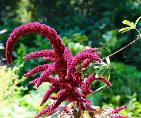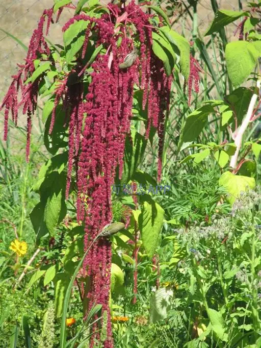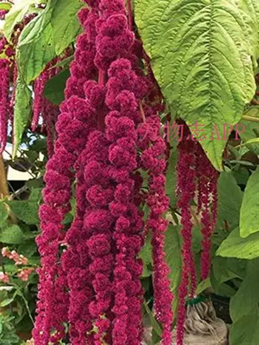 尾穗苋(Amaranthus caudatus L.)苋科一年生草本,高达1.5米;茎直立,粗壮,具钝棱角,单一或稍分枝,绿色,或常带粉红色,幼时有短柔毛,后渐脱落。叶片菱状卵形或菱状披针形,顶端短渐尖或圆钝,具凸尖,基部宽楔形,稍不对称,全缘或波状缘,绿色或红色,除在叶脉上稍有柔毛外,两面无毛;胞果近球形,直径3毫米,上半部红色,超出花被片。种子近球形,直径1毫米,淡棕黄色,有厚的环。花期7-8月,果期9-10月。