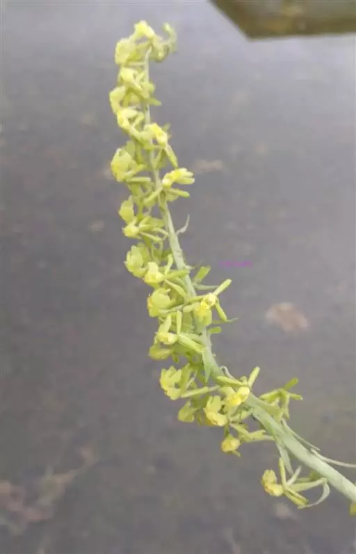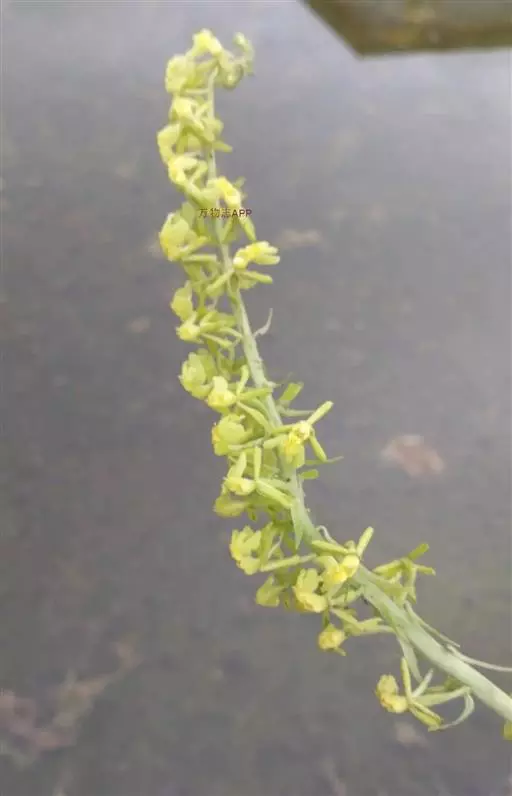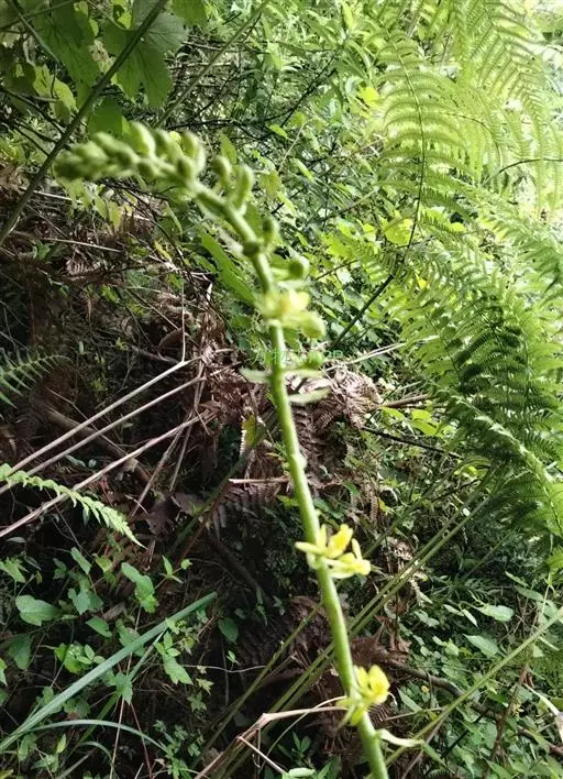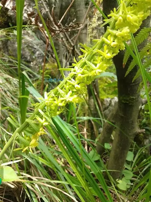 花葶出自叶腋,直立,粗壮,长达120厘米,密被细花;花序之下疏生数枚紧贴花序柄的筒状鞘;鞘膜质,下面的长达10厘米,无毛;总状花序长8-20(-30)厘米,密生许多小花;花苞片宿存,草质,反折,狭披针形,近等长于花梗和子房,长1-1.5厘米,基部宽1.5-2毫米,先端渐尖,背面被短毛;花黄绿色、白色或有时带紫色;萼片和花瓣反折;萼片相似,近椭圆形,长6-9毫米,中部宽约4毫米,先端锐尖或稍钝,具5条脉,中央3条脉较明显,背面近无毛或密被短毛。