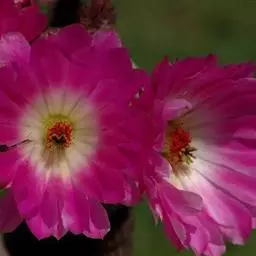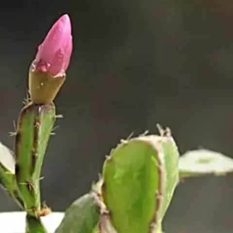 仙人指。花瓣为多层,规则而又整齐。雌蕊红色,雄蕊白色,均较长,伸出花筒外,与蟹爪兰相类似。花色为玫瑰红色。