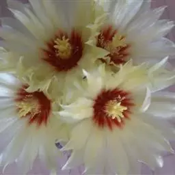 蟹爪兰。花筒长而弯曲,花瓣为多层,下部花瓣向上翻卷,花瓣不规则、不整齐。雌蕊红色,雄蕊白色,均较长,伸出花筒外。花色有黄、白、橙、粉、红、紫、雪青等色,另还有复色品种。从瓣型上看又有锐尖瓣、钝尖瓣、圆瓣之分。目前有园艺种达200多个品种。