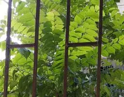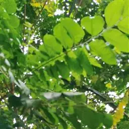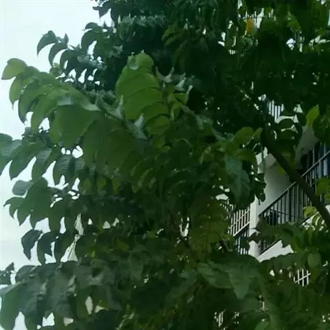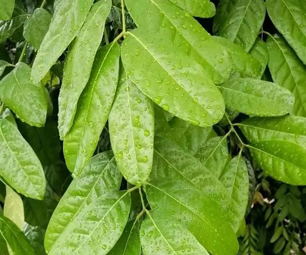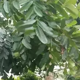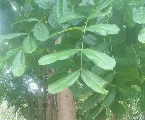 叶互生,叶轴和叶柄圆柱形,无毛,长15-60厘米或更长;小叶6-16,近对生或互生,顶端2对小叶对生,长圆形或长圆状椭圆形,下部小叶卵形,长7-17厘米,宽3-6厘米,先端短渐尖或急尖,基部宽楔形或略圆形,稍不对称,叶面深绿色,背面苍绿色,侧脉9-14对,干后两面稍突起,全缘;小叶柄长5-10毫米。