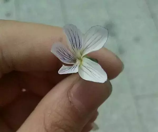花白色或淡紫色,有深色条纹,长1.4-1.7厘米;花梗细长,与叶等长或超出于叶,通常无毛,有时仅下部有细毛,中部附近有2枚线形小苞片;萼片卵状披针形或狭卵形,长5-6毫米,先端渐尖或稍尖,基部附属物较短,长0.5-1毫米,末端圆,有时疏生钝齿,具狭膜质缘,具3脉;上方花瓣倒卵形,长1-1.2厘米,侧方花瓣长圆状倒卵形,长1-1.2厘米,里面基部密生或有时生较少量的须毛,下方花瓣通常稍短,连距长1.3-1.5厘米;距管状,稍短而粗,长2-6毫米,粗2-3.5毫米,末端圆,直或稍向上弯;花药及药隔顶部附属物均长约2毫米,下方2枚雄蕊具长1-3毫米的距;子房卵球形,长约2毫米,无毛,花柱棍棒状,基部稍向前膝曲,上部逐渐增粗,柱头两侧及后方略增厚成狭缘边,前方具明显的短喙,喙端具柱头孔。
