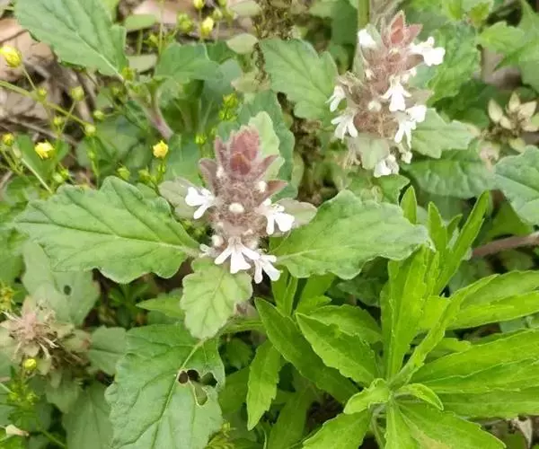 白苞筋骨草Ajuga lupulina Makino,植株通常直立,稀葡匐,苞叶比花长,通常为白黄色,白色或绿紫色。在江西与筋骨草同等入药。