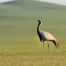 蓑羽鹤大型涉禽,体长68~92厘米,是鹤类中个体最小者。通体蓝灰色,眼先、头侧、喉和前颈黑色,…