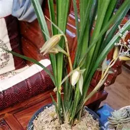 建兰素花,绿白色,清香,一枝开花5至12朵。叶色钢青,细而挺拔,有铮铮铁骨之相,所以叫铁骨素。在日…