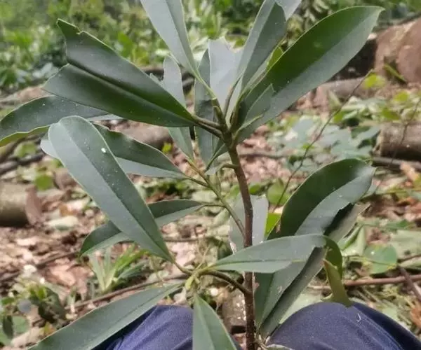 叶革质、狭倒卵形、狭椭圆状倒卵形,或倒披针形,长8-17厘米,宽2.5-5.5厘米。先端短急尖,通常尖头钝,基部楔形,沿叶柄稍下延,边缘稍内卷,下面疏生红褐色短毛;侧脉每边8-12条;叶柄长1-3厘米,基部稍膨大;托叶痕半椭圆形,长3-4毫米。