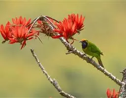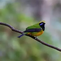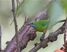 橙腹叶鹎体形大小和金额叶鹎相似,体长16~20厘米。额至后颈黄绿色,其余上体绿色,小覆羽亮钴蓝色,…