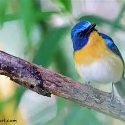 山蓝仙鹟:小型鸟类,体长13-15厘米。雄鸟额基和眼先黑色,颏橙棕色,仅颏尖为蓝黑色,…