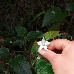 花单生,顶生,稀2-3朵,直径达2厘米;花梗长2-4厘米,被长柔毛和针刺;苞片和托叶相似;花萼长1.5-2厘米,外面密被针刺和长柔毛;萼筒卵球形;萼片不等大,叶状,卵形至卵状披针形,外萼片宽大,梳齿状深裂或缺刻状,内萼片较狭,顶端渐尖,有少数锯齿或全缘;花瓣狭倒卵形,白色,有爪,稍短于萼片;雄蕊多数,直立,无毛;雌蕊多数,但很多败育,子房顶端和花柱基部微具柔毛。果实红色,球形,直径1-1.5厘米,具反折萼片;小核近光滑或微皱。花期5-7月,果实7-8月。