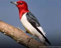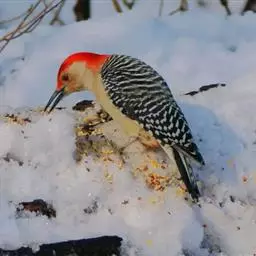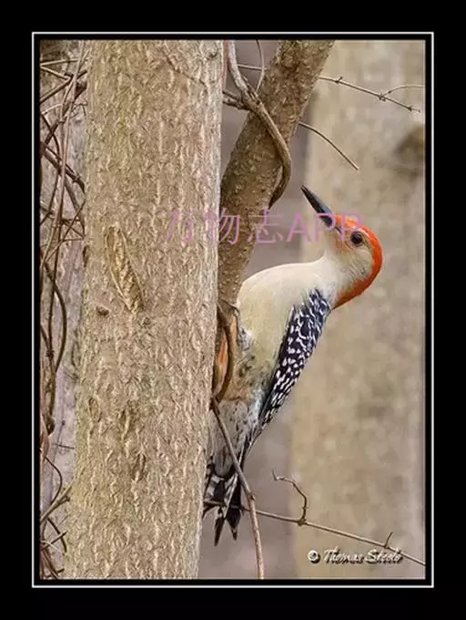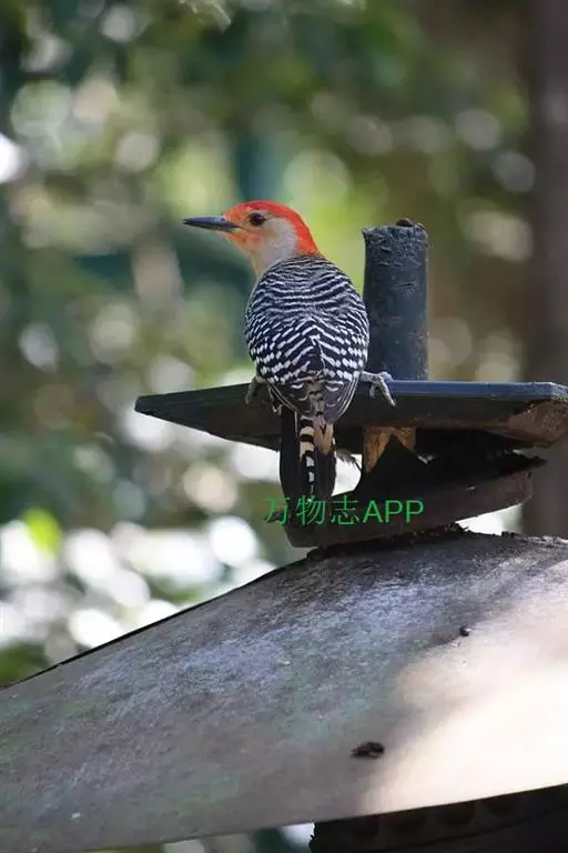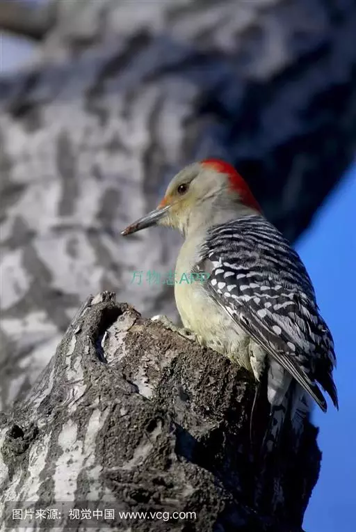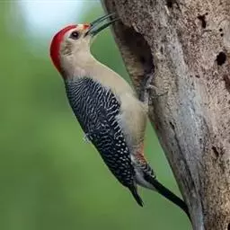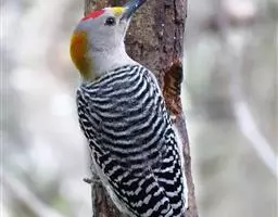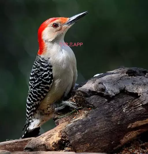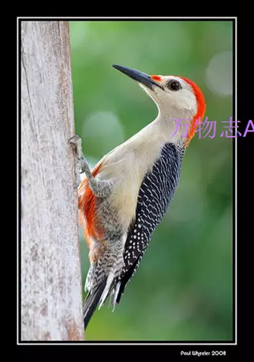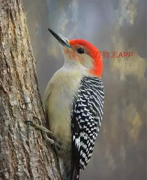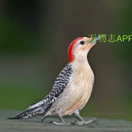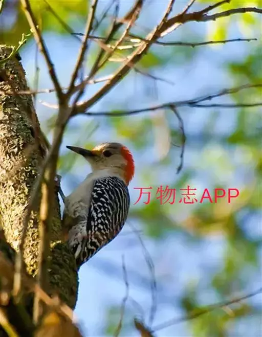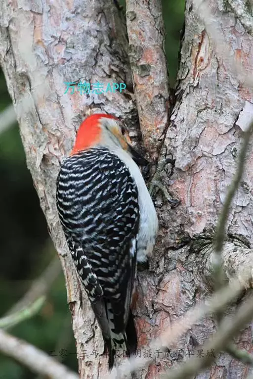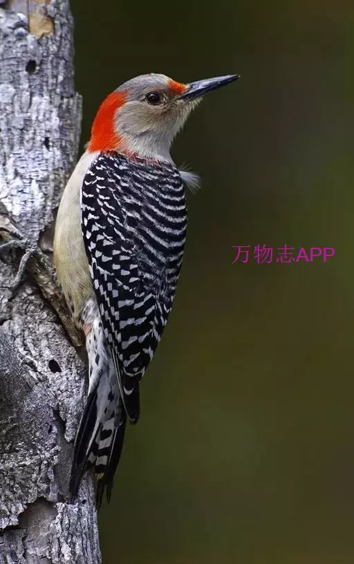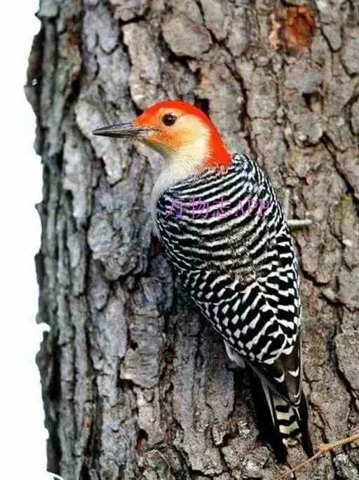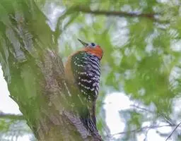 红腹啄木鸟(学名:Melanerpes carolinus)成年雄鸟头项有红帽,翅膀和上体是黑白相间的斑纹状羽毛,腹部有一片红羽毛。头亦大,但颈较长,嘴强硬而直,呈凿形,鼻孔裸露;尾羽羽干大都硬挺且尖,尾羽12片,初级飞羽9片。头骨为蜥腭型,锄骨被一些成对的骨片所代替,颌腭骨细小远离两侧,胸骨后端每侧有2切刻,胸骨柄分叉。腿肌肉缺栖肌和副股尾肌;角舌骨延成环带状,两侧自咽喉绕过枕部至上嘴基。生活于湿地生境,枯在树木,低地沼泽森林,也出没于茂密的森林,河流沿岸。分布于北美洲。