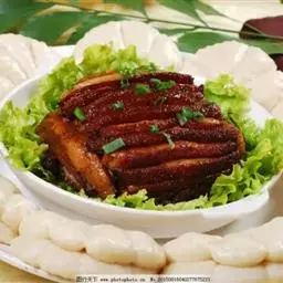 2、炒锅内铺上葱姜,将肉皮朝下放在姜葱上,加绍酒、白糖、酱油、精盐1.5克、肉汤200克,加盖用旺火煮沸,置小火上烧约半小时,加入红曲米粉,使肉呈深红色,捞出装在碗内,加原汁汤,上蒸笼旺火蒸酥为止。