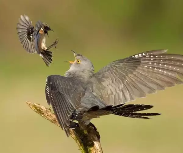 大苇莺在喂养体形比自己还大的大杜鹃雏鸟