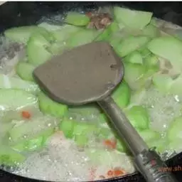 7 烧开锅内的水,放入瑶柱丝瓜,加盖开大火隔水清蒸10分钟。