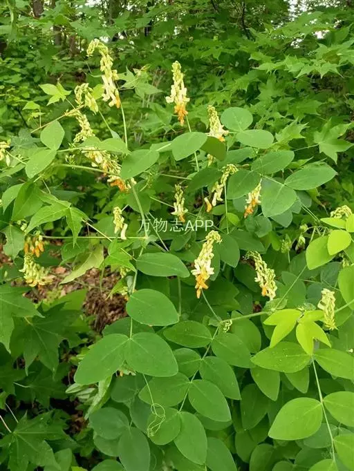 茳芒香豌豆:又名茳芒决明香豌豆。多年生草本,高80-100cm。茎近直立或斜升,圆柱状。叶互生;托叶大,半箭头形,全缘或下缘稍有锯齿;偶数羽状复叶,小叶6-8片,上部叶轴顶端常具分歧的卷须,下部叶轴多为单一的卷须或成长刺状;小叶片卵形或椭圆形,有时为菱状卵形或长卵形,长4-10cm,宽1.5-6cm,先端钝或圆形,具短刺尖,基部圆形或宽楔形,两面无毛,下面带苍白色;叶脉网状。总状花序腋生,通常有花10余朵;萼钟形,萼齿三角形至锥形,花黄色,长1.6-2cm,雄蕊10,二体,子房无毛。荚果条形,两面膨胀,长6-10cm,宽约5mm,无毛。种子多数,近球形,径约3mm。花期6-7月,果期8-9月。