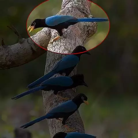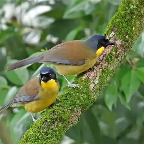 黄喉噪鹛体型略小,顶冠蓝灰色,特征为具黑色的眼罩和鲜黄色的喉。上体褐色,尾端黑色而具白色边缘,…