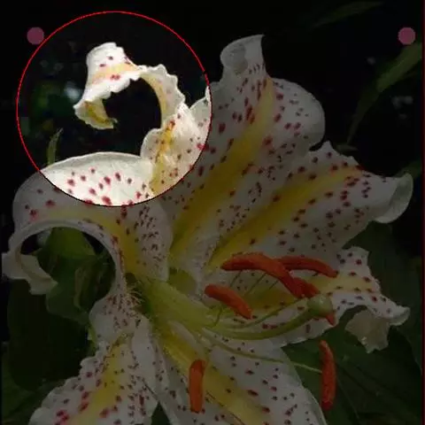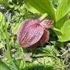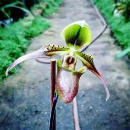 花序顶生,具1花;花序柄长4-5厘米,无毛;花苞片不存在;子房长1-1.5厘米,常多少弯曲,有3棱,棱上疏被短柔毛;花较美丽,萼片绿黄色有栗色纵条纹,花瓣与唇瓣白色或淡黄色而有红色或栗红色斑点与条纹;中萼片宽卵形,通常长3-4厘米,宽2.5-3.5厘米,先端钝或具短尖头,背面脉上有短毛,边缘有乳突状缘毛;合萼片椭圆状卵形,略短于中萼片,宽2-2.5厘米,先端钝并有很小的2齿,边缘亦有乳突状缘毛。