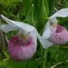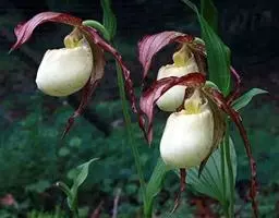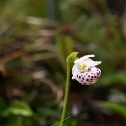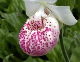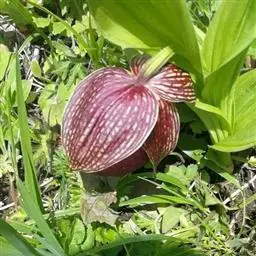 斑叶杓兰(学名:Cypripedium margaritaceum Franch.):植株高约10厘米,地下具较粗壮而短的根状茎。茎直立,较短,顶端具2枚叶。叶近对生,铺地;叶片宽卵形至近圆形,上面暗绿色并有黑紫色斑点。花序顶生,具1花;花较美丽,萼片绿黄色有栗色纵条纹,花瓣与唇瓣白色或淡黄色而有红色或栗红色斑点与条纹;花瓣斜长圆状披针形,向前弯曲并围抱唇瓣,长3-4厘米,宽1.5-2厘米,先端急尖,背面脉上被短毛;唇瓣囊状,近椭圆形,腹背压扁。花期5-7月。