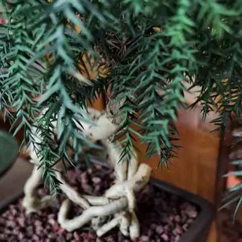 澳洲杉,常绿乔木,一般盆栽为幼树,高在2米以下。喜温暖、潮湿的环境,树冠尖塔形,深绿色。茎干直立,…