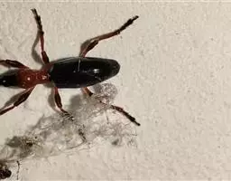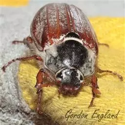 长约22mm,宽约10mm,淡黄色或杏黄色。成虫长椭圆形,背翅坚硬,体长约20mm,宽约10mm。羽化初期为红棕色,后逐渐变深成红褐或黑色,全身披淡蓝灰色闪光薄层粉,前胸背板侧缘中间呈锐角状外突,前缘密生黄褐色体毛。腹部圆筒形,腹面微有光泽 。