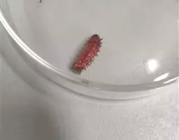 学名蛴螬,老熟幼虫体态肥胖,长约20mm,宽约6mm,体白色,头红褐色,静止时体形大多弯曲呈C型,体背多横纹,尾部有刺毛 。