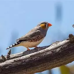 橙颊梅花雀体长约10厘米,头部灰色,两侧有大块橙色区域,嘴基及眼下方有黑纹,两条黑纹间呈白色,…