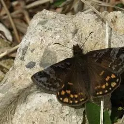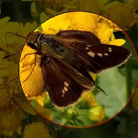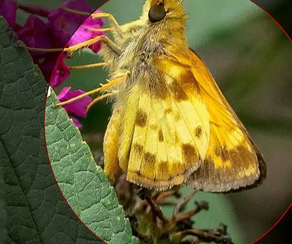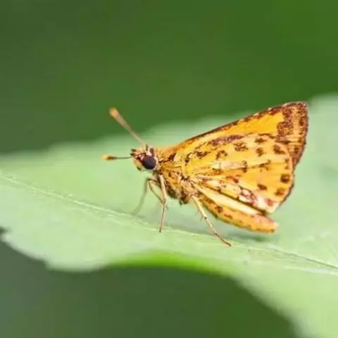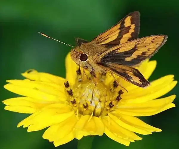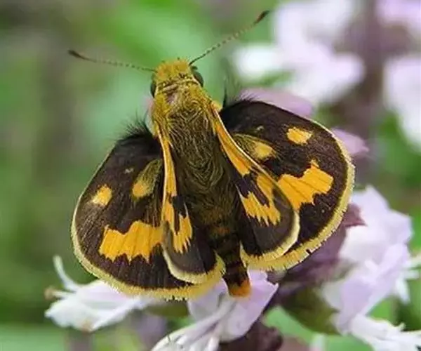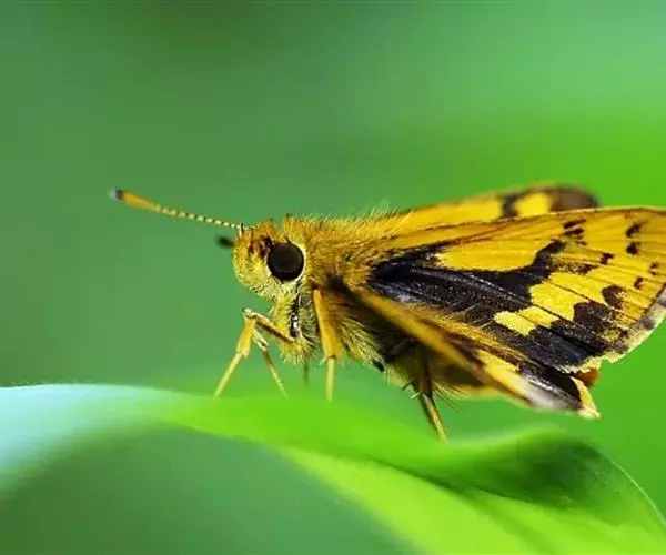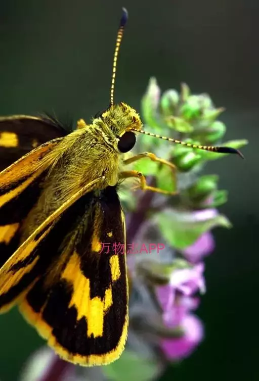 本种为小型种。 体长12一14毫米,头色黑褐, 复眼深黑色,具反光。 触角长约 7 毫米左右 。 丝状部分黄黑相间 , 棒状部的背面全黑,腹面全黄, 顶端有弯钩 , 几 为全黑色。 雄蝶前翅长为12毫米,翅面深黑,黄斑宽阔, 翅前缘下方和翅后缘上方各有一长条形黄色条斑一枚, 别卜在前翅中室内具有大型近似扁月形的黄斑一枚。 翅背面的黄斑略同翅面 , 后翅长 9.5毫米, 翅面黑色, 中域区饰有宽阔的一字黄斑一枚 , 其上方具有黄色圆点二枚, 分别位于中室外