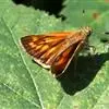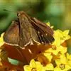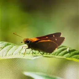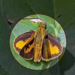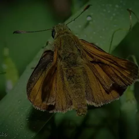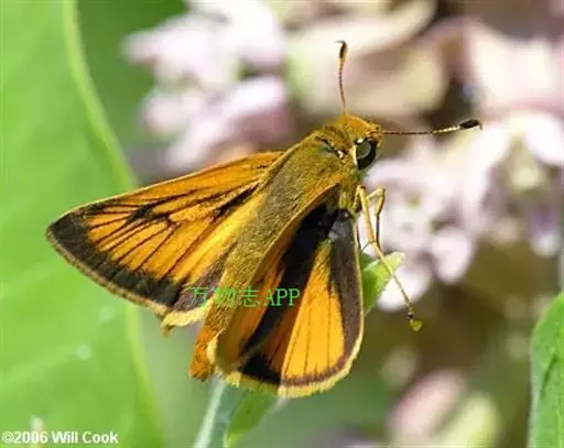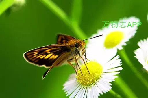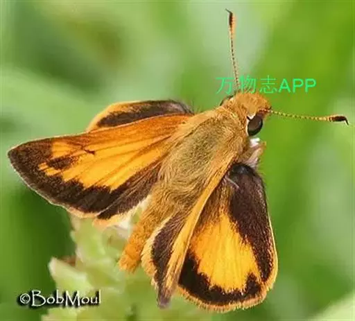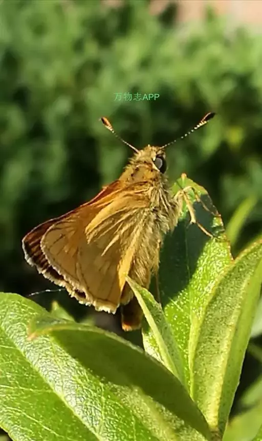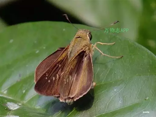 弄蝶科,展翅25 - 30 mm, 翅膀表面底色黑褐色,近后缘有一条橙黄色宽广的横带,翅腹面黄褐色具稀疏的黄斑,斑纹为近似种中较不明显。本种分布於平地至低海拔山区,常见於阳光下访花吸蜜,数量很多,为常见的种类。