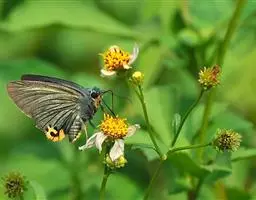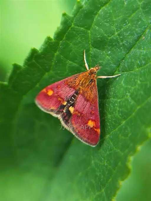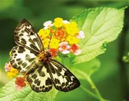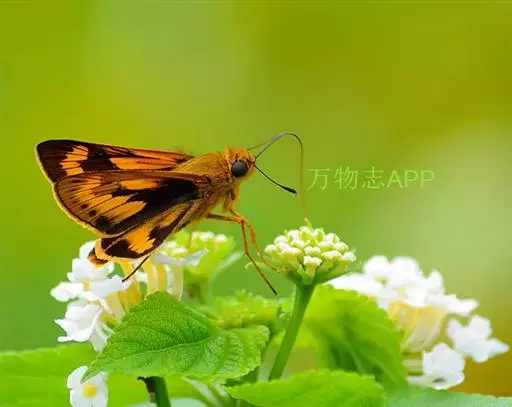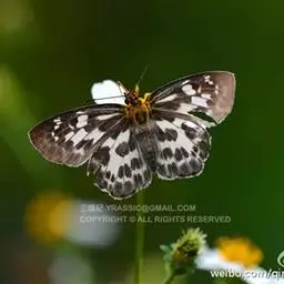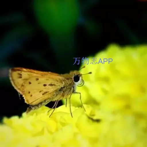 端及第七翅室中部。 雌蝶前翅长为11一 15毫米, 后翅长为 .8 , 毫米左右 ,翅面斑纹与雄蝶基本相同 , 只是前翅前缘下方的黄色条斑不太明显。 雌雄蝶后翅底面均为黄色,上有黑点数个 ,翅外缘均附有黄色缘毛。