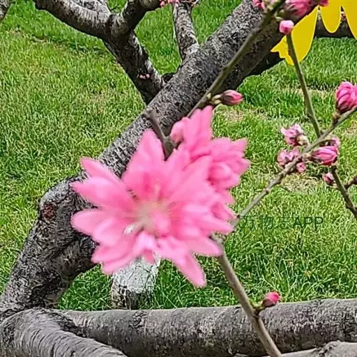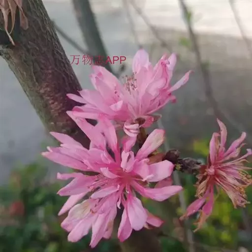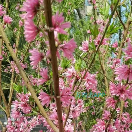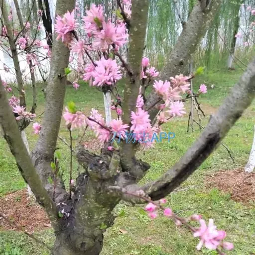 直枝桃类。树势中等;干皮深灰色,小枝细长柔弱,黄褐色,节间较长,2.3厘米。花粉色;花蕾卵形;花瓣披针卵形,不规则扭曲,边缘呈不规则的波状,长2.13厘米,宽0.6厘米;花径4.53厘米,复瓣,菊花型,花高2厘米;花瓣数29枚(22-32),雄蕊数平均32.7,花丝长1厘米,花丝卷曲,有瓣化现象,花药黄色;雌蕊略高于雄蕊;着花中等;花萼红褐色偏绿,两轮;花梗长0.43厘米。叶绿色略显灰,边缘略卷,椭圆披针形,长10.2厘米,宽2.82厘米,叶长与叶宽比(L/W)为3.62;叶缘细锯齿,叶柄0.92厘米;肾形蜜腺2-3个。果实绿色,尖圆形,长4.02厘米,宽3.05厘米;果核长2.92厘米,宽1.56厘米,椭圆形;核面粗糙。花期4月中旬。
