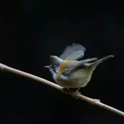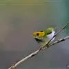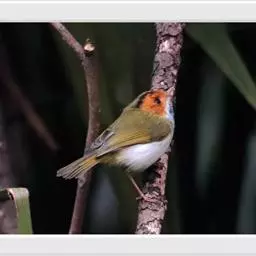 棕脸鹟莺:体长10厘米,是一种色彩亮丽而有特色的莺鸟。头栗色,具黑色侧冠纹。上体绿,腰黄色。下体白,…