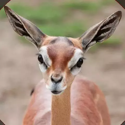 鹅喉羚颈细而长,雄兽颈下有甲状腺肿,形似鹅喉,故称鹅喉羚。上体毛色沙黄或棕黄,吻鼻部由上唇到眼平线白色,有的个体略染棕黄色调,额部、眼间至角基及枕部均棕灰,其间杂以少许黑毛,耳外面沙黄,下唇及喉中线亦为白色,而与胸部、腹部及四肢内侧之白色相连。 [2-3]