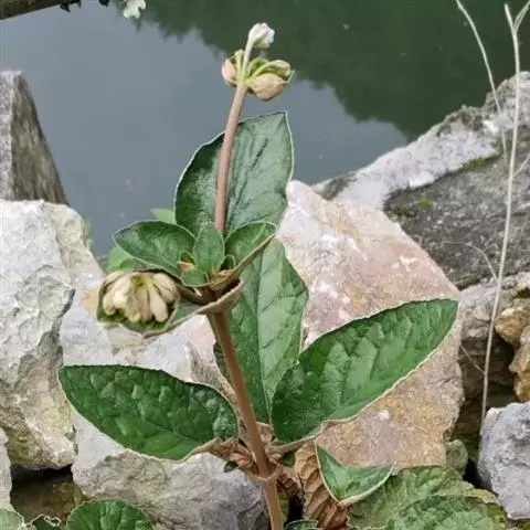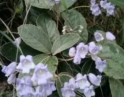 小灌木。茎常弯曲,高达30厘米,幼枝具褐色毡毛,节间短。叶对生,具叶柄;叶片长圆形,长圆状倒披针形或披针形,长5.5-25厘米,宽2.4-9厘米,顶端短尖,基部楔形或宽楔形,边缘生小钝齿或近全缘,幼时上面被灰白色或淡褐色绵毛,后变近无毛,下面密被淡褐色毡毛,侧脉每边10-13条,下面隆起;叶柄长3-6厘米,被褐色毡毛。聚伞花序伞状,成对腋生,具10余花;花序梗长2.5-5.5厘米,密被褐色毡毛;苞片2,圆卵形,长1-1.5厘米,宽9-12毫米,顶端钝,基部合生,全缘;花梗长8-10毫米,具短绵毛。花萼绿白色,常带紫色,5裂至近基部,裂片相等,倒披针状匙形,长8-13毫米,宽4-6毫米,顶端圆形,全缘,两面近无毛。花冠紫蓝色,长1.5-2厘米,直径约1.5厘米,外面无毛;筒长1-1.3厘米;檐部广展,稍二唇形,上唇比下唇略短,2裂,裂片相等,近圆形,长约7毫米,宽约5毫米,下唇3裂,裂片相等,近圆形,长约5毫