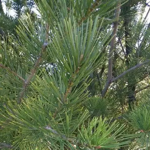 针叶5针一束,长6-12厘米,粗硬,直,深绿色,边缘具细锯齿,背面通常无气孔线,腹面每侧具6-8条淡蓝灰色的气孔线;横切面近三角形,皮下层细胞单层,但在背面两树脂道之间常出现断续的分布着1-3或多至15个细胞宽的第二层皮下层,树脂道3个,中生,位于三个角部;叶鞘早落。