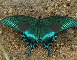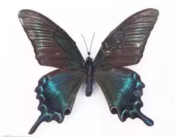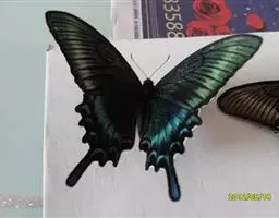 天堂凤蝶翅展可达105mm。前、后翅自基角至后缘约1/2~2/3端为纯净的宝蓝色,后角至后缘1/3…