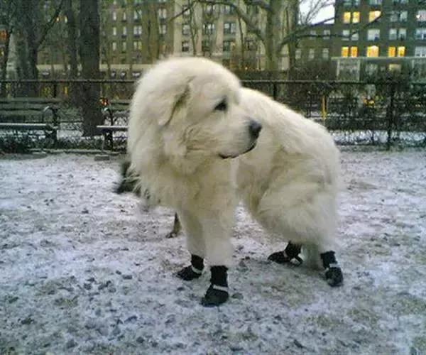 被毛是白色或以白色为主,夹杂了灰色、或不同深浅的茶色斑纹。被毛是由两层毛组成的。能抵御任何气候条件。颜色一般白色或白色带有灰色、红褐色或不同深浅的茶色斑纹。但披毛上的杂色斑纹不超过身体的三分之一。