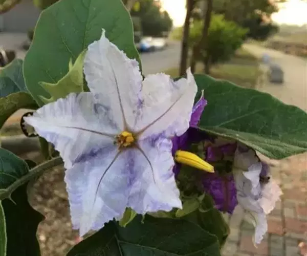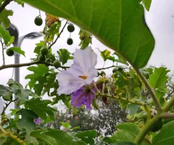 大花茄,别名木番茄,原产南美洲的玻利维亚至巴西。常绿大灌木或小乔木,株高3至5米,茎直立,小枝及叶柄具刚毛与皮刺,叶互生,叶片大、通常羽状半裂,叶面具刚毛状单毛。花腋生,花冠粉红色,果实大。
