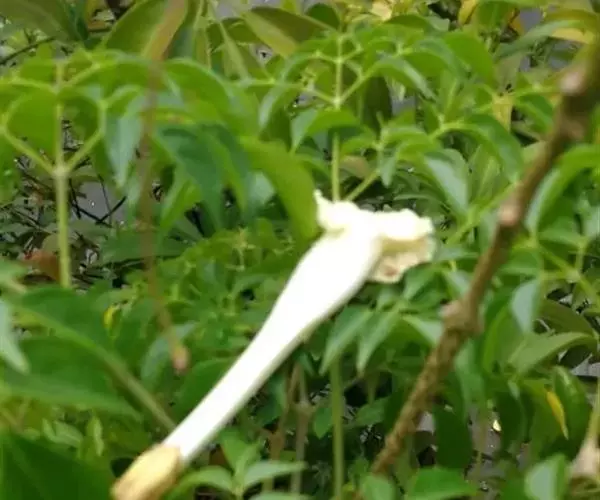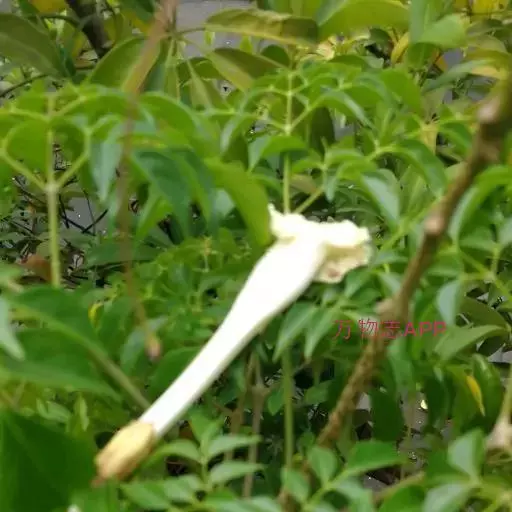 叶轴长约30厘米左右;小叶卵形至卵状披针形,长4-7厘米,宽2-3.5厘米,顶端尾状渐尖,基部阔楔形,全缘,侧脉5-6对,向上斜伸,两面均无毛,侧生小叶片在近基部的一侧疏生少数盘菌状腺体;侧生小叶柄长在5毫米以下,顶生小叶柄长1-2厘米。顶生圆锥花序,直立,长25-35厘米,宽30厘米;苞片线状披针形,长可达10厘米,早落,苞片线形,长4-6厘米。花萼蕾时封闭,锥形,内包有白色乳汁,萼齿5,卵状披针形,中肋明显,长约12毫米。花冠钟状漏斗形,白色至淡黄色,长约6-8厘米左右,裂片5,圆形,具皱纹,长约2.5厘米。雄蕊4,2强,光滑,退化雄蕊存在,丝状。子房光滑,2室,胚珠每室二列,花柱外露,柱头2裂。蒴果细长,下垂,圆柱形,稍弯曲,多沟纹,渐尖,长达85厘米,径约1厘米,果皮薄革质,小皮孔极不明显;隔膜细圆柱形,微扁。种子椭圆形,连翅长约2厘米,宽约5毫米。花期5-9月,果期10-12月。