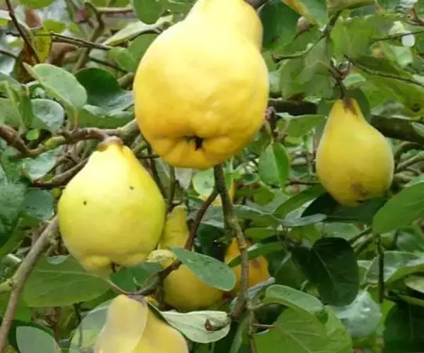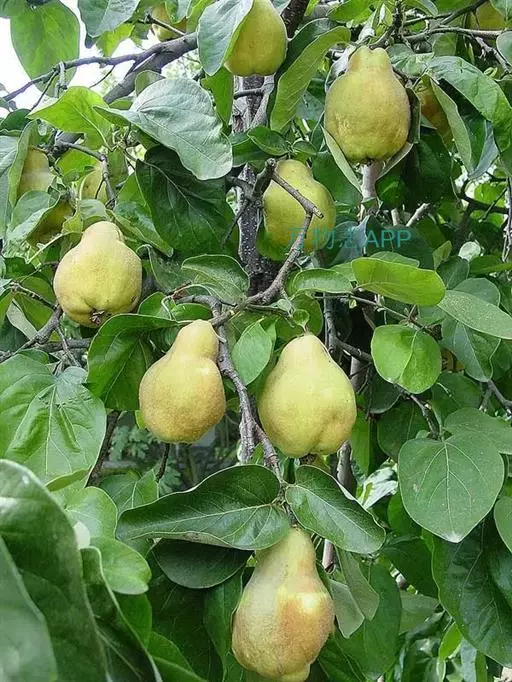 树冠较大,开张。叶长约6.5cm,宽约5.2cm,叶柄长约1.3cm。果实短圆锥形,纵径6.6cm,横径6.8cm。梗部有绿色瘤状突起。果面毡茸较薄,易脱落。花瓣残存,萼洼深广。果肉米黄色,肉韧、汁少,味酸甜,香味浓。心室5~7个,种子较多,黄褐色,可溶性固形物14%。