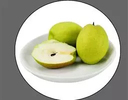 果实扁圆形或圆形,纵径5.05cm,横径5.68cm,中等大。萼洼中深中广,毡茸棕灰色,易脱落。果肉白黄色,果心大,间距亦大。心室5个,圆形闭合。肉粗汁少味淡,可溶性固形物10%。9月下旬成熟。