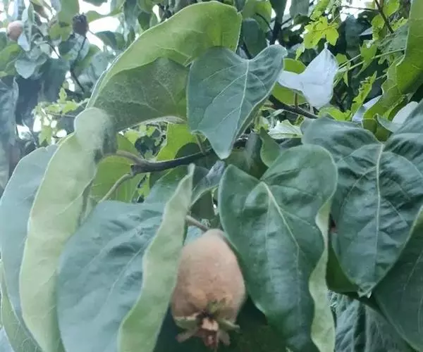 树冠比大榅桲小,开张,叶长约8.3cm,宽约7.2cm,叶柄长约1.4cm,叶大。果实球形或扁圆形,纵径6.4cm,横径7.3cm。果面沟纹不规则,凸凹不平。果皮绿色,毡茸厚,灰白色,不易脱落。果梗部有绿色瘤,扁平。萼片残存,萼洼广浅。果肉白黄色,味甜酸,涩味浓,汁多,肉粗松,经贮藏后仍呈绿色或黄绿色,种子黑褐色。果实成热后能长期在树上不落,极耐贮藏。