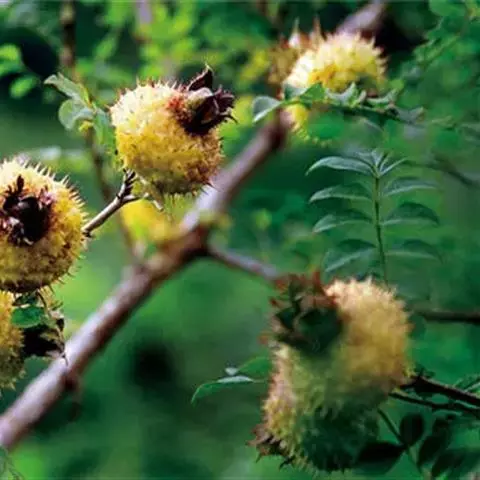 果实卵球形或椭圆形,直径1~1.5厘米,褐色,有稀疏斑点,萼片宿存,4~5室;果梗长2~3.5厘米。花期4月,果期8~9月。