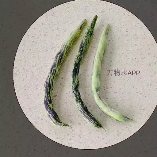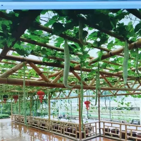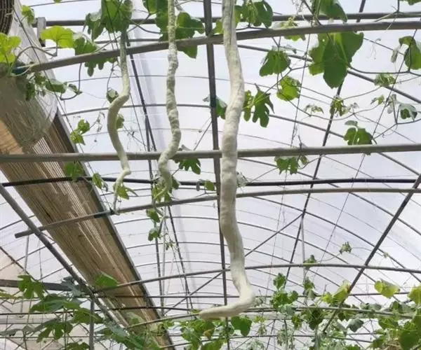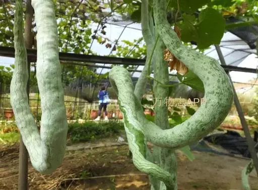 蛇瓜自瓜柄开始有数条绿色线纹,瓜体有的垂直,有的弓身,有的弯曲,有的卷尾,酷似—条条长蛇在棚架下展姿。在嫩瓜期,瓜体表面有白绿色相间的条纹似白花蛇,老熟后的瓜体表面又呈现红绿色相间的条纹似红花蛇,体态各异,栩栩如生,稀奇而美观。