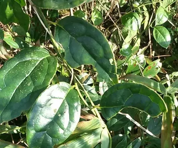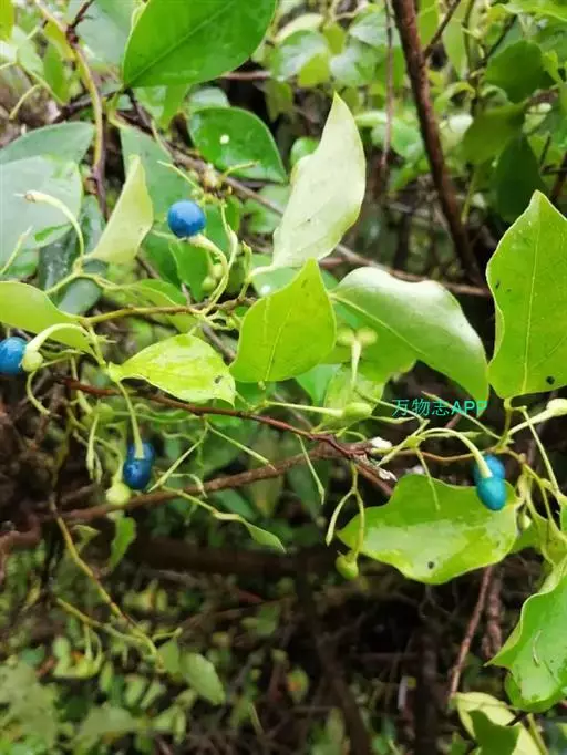 落叶攀援木质藤本;嫩枝绿色,被细柔毛,老枝紫褐色,具白蜡层,常留有木质化成单刺状或双刺状的叶柄基部。芽鳞阔卵形,具缘毛。叶近纸质,卵状椭圆形、卵形或阔卵形,长3.5-9厘米,宽2-4.5厘米,叶面深绿色,中脉有稀疏毛,叶背带白色,脉上被稀疏柔毛,侧脉每边3-5条;叶柄长2-5毫米,被柔毛。