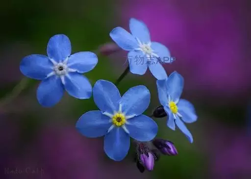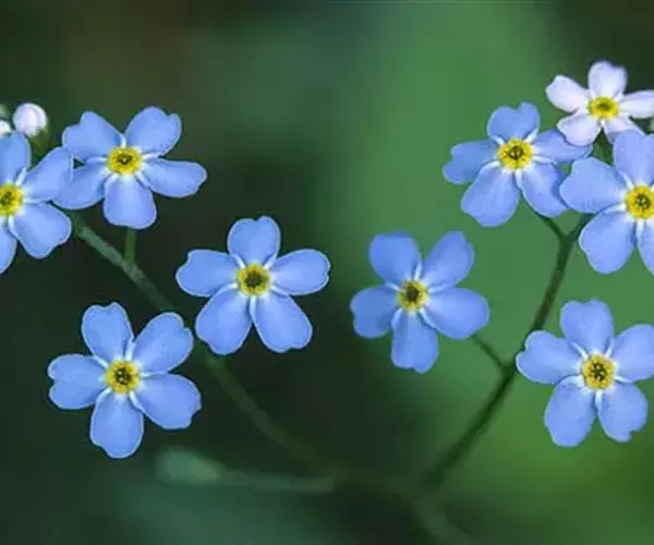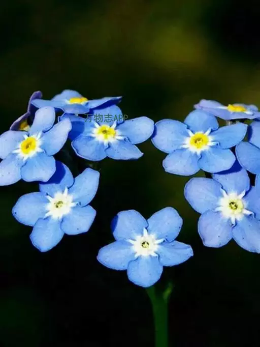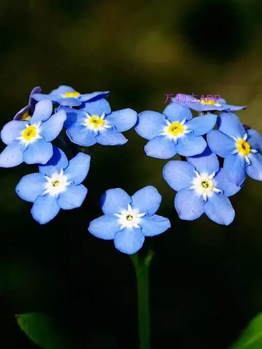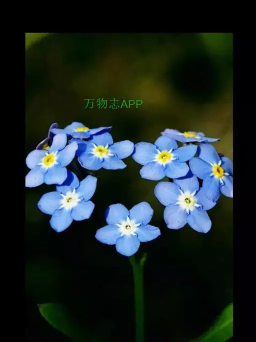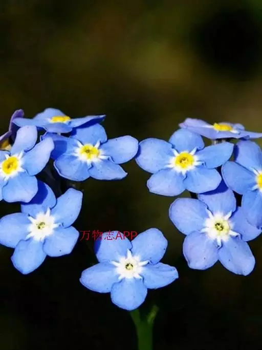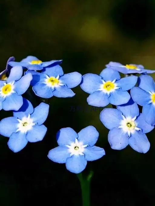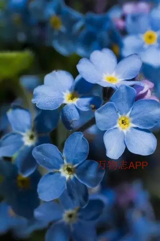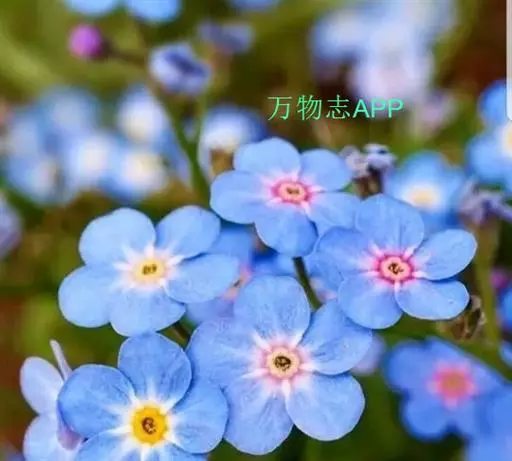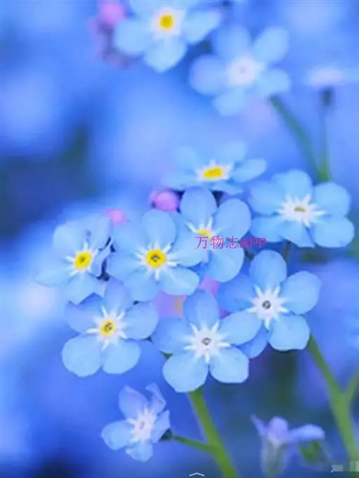 勿忘草 勿忘草株形柔美,茎枝纤细,叶片的形状很像柳树的叶子,无数朵小蓝花开满茎顶部的每个小枝,花瓣的蓝色仿佛是由天空的颜色染成的让人充满无限遐想。花朵中央有一圈黄色心蕊色彩搭配非常和谐。