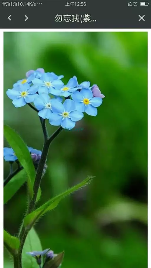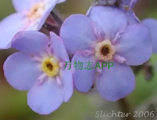 勿忘草 多年生草本。茎直立,单一或数条簇生,高20-45厘米,通常具分枝,疏生开展的糙毛,有时被卷毛。基生叶和茎下部叶有柄,狭倒披针形、长圆状披针形或线状披针形,长达8厘米,宽5-12毫米,先端圆或稍尖,基部渐狭,下延成翅,两面被糙伏毛,毛基部具小形的基盘;茎中部以上叶无柄,较短而狭。