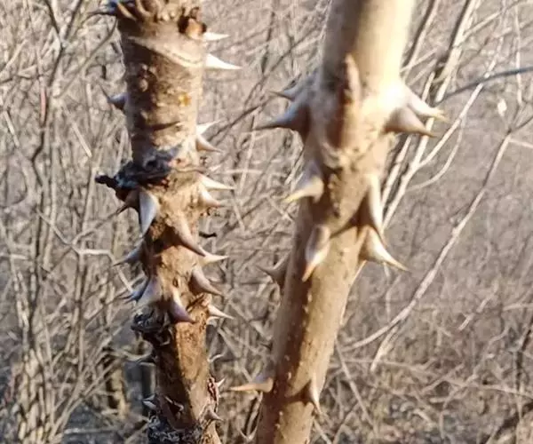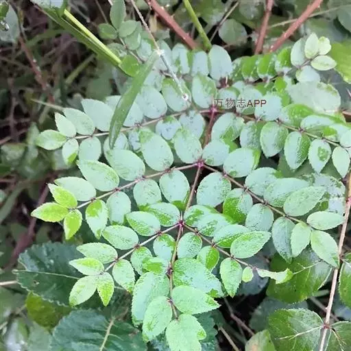 灌木或乔木,高2-5米,稀达8米,胸径达10-15厘米;树皮灰色,疏生粗壮直刺;小枝通常淡灰棕色,有黄棕色绒毛,疏生细刺。叶为二回或三回羽状复叶,长60-110厘米;叶柄粗壮,长可达50厘米;托叶与叶柄基部合生,纸质,耳廓形,长1.5厘米或更长,叶轴无刺或有细刺;羽片有小叶5-11,稀13,基部有小叶1对;小叶片纸质至薄革质,卵形、阔卵形或长卵形,长5-12厘米,稀长达19厘米,宽3-8厘米,先端渐尖或短渐尖,基部圆形,上面粗糙,疏生糙毛,下面有淡黄色或灰色短柔毛,脉上更密,边缘有锯齿,稀为细锯齿或不整齐粗重锯齿,侧脉7-10对,两面均明显,网脉在上面不甚明显,下面明显;小叶无柄或有长3毫米的柄,顶生小叶柄长2-3厘米。