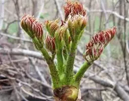 楤木栽植2年后就可采收,但一般主要在3年后集中采收,防治破坏幼树。楤木在木本植物中属于较早萌发顶芽的类型,一般在4月末到5月上中旬,随着气温逐渐升高,温度在15-20℃时,楤木枝条“弹头状”芽苞开始生长、膨大,这个时间楤木顶芽、侧芽均长到10厘米左右,已有2-3枚鲜嫩叶,而叶片还尚未全部伸展,这时就可采收。采收不要过早,过早会对周围还未萌发的芽点造成破损,同时产量较低,采收过晚,叶片全部展开,茎秆粗壮影响品质,口感变苦,商品价值严重下降。所以,要根据栽培的时间和技术要求做到科学适时采收,保证楤木芽菜的产量和质量。采收时要注意避免碰伤临近未发的嫩芽,同时注意不能全部采完,要保留适当的生长后备芽,否则易造成死苗。