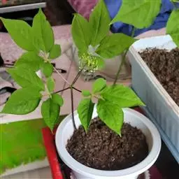挑选已萌发的健壮种子点播在装有基质的花盆中,基质为腐熟的鸡粪、腐熟的牛粪、细土按体积1:1:1的比例配制,基质用多菌灵毒土法消毒,每平方米用50%多菌灵10克与配好的干基质拌匀,在播种前将1/3药基质撒在花盆上作垫土,将种子播在上面后,再将剩下的2/3 药基质作覆土。撒后在基质土壤表面适量洒水,保持土壤湿润,以免过干产生药害。在智能温室25℃、75%相对湿度的条件下培养直至培育出幼苗。