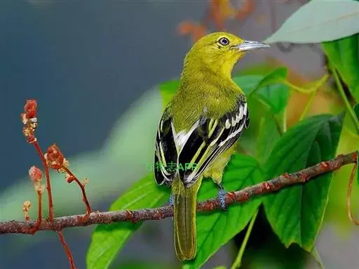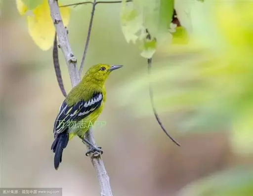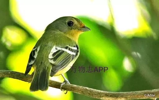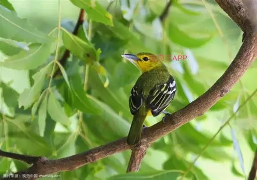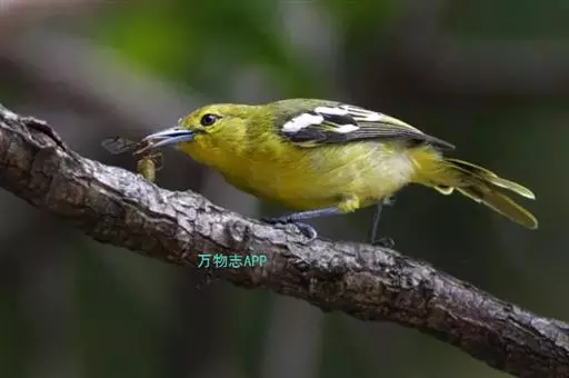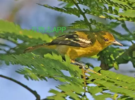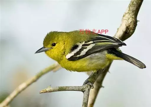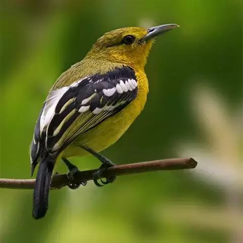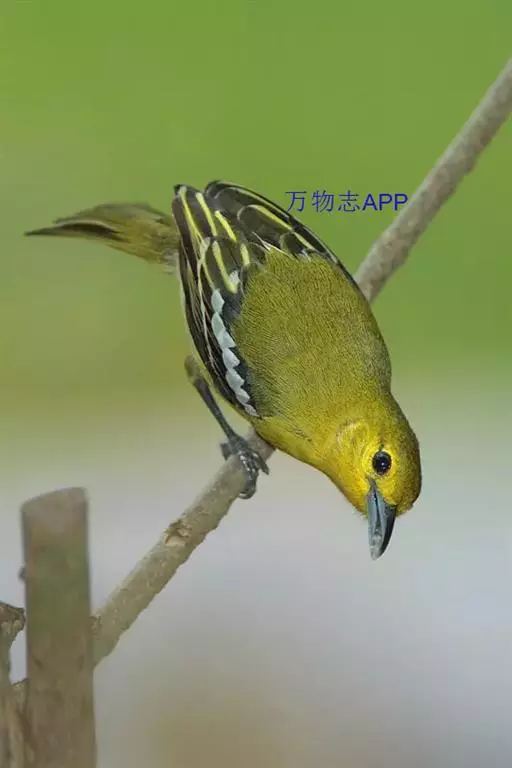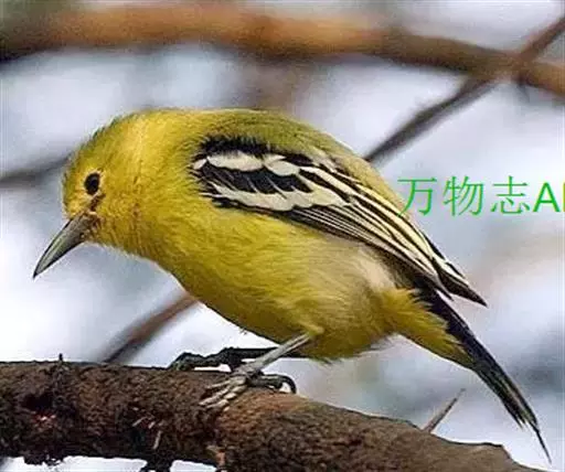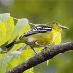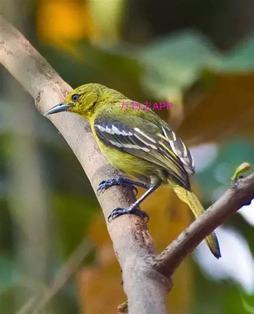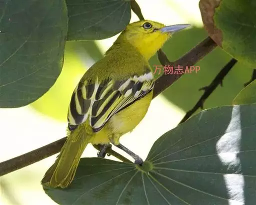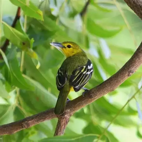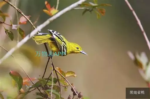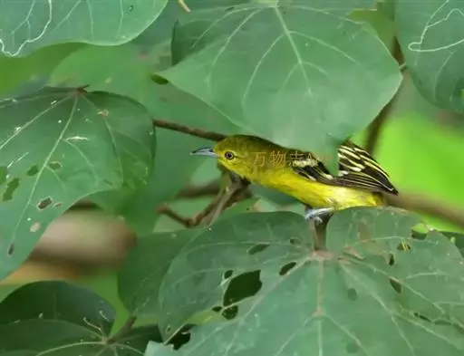 黑翅雀鹎(学名:Aegithina tiphia):体重14-19克,体长11.5-16厘米。是树栖性绿色小鸟,外形与叶鹎相似,下体黄色。鸟喙直,翼长而尖,总体羽毛是绿色和黄色相结合,翼上具两道明显近白色横纹,翼近黑而羽缘白。虹膜灰色、淡黄色或棕红色,嘴灰蓝色、银灰色或黑色,跗蹠灰色。