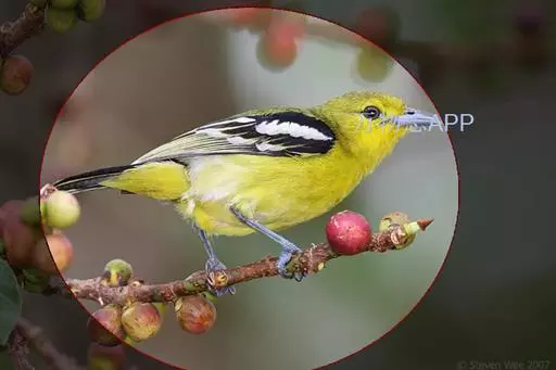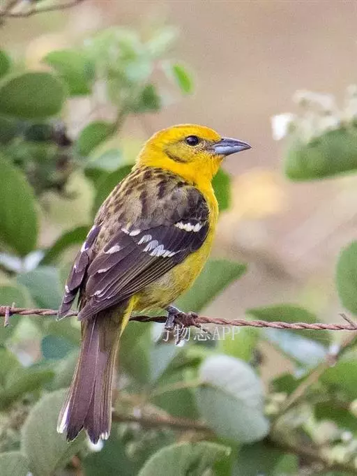 黑翅雀鹎 黑翅雀鹎的雄鸟额酪黄色,头顶橄榄黄绿色,有的枕部杂有黑色。背肩橄榄黄绿色,有时羽端或多或少杂有黑色。两翅黑色,翅上小覆羽黑色而具光泽,中覆羽和大覆羽具白色端斑,在翅上形成两道明显的白色翼斑,其中前面一道宽阔。大覆羽具浅黄色狭缘。飞羽黑色,除最外侧1-2对飞羽外,其余飞羽和初级覆羽外翈先端转白,最内侧飞羽内翈亦具白色羽缘。尾上覆羽和尾羽亮黑色。尾羽先端及外侧尾羽外翈缀橄榄黄色。